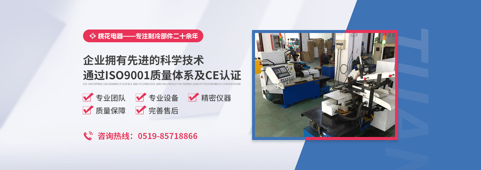 常州桃花電器有限公司地處中國長江“金三角”之稱的上海至南京高速公路、城際高鐵、常州高新經(jīng)濟(jì)技術(shù)開發(fā)區(qū)路段,交通便利、技術(shù)力量十分雄厚。它是集研究、開發(fā)設(shè)計、制造和經(jīng)營制冷核心部件的企業(yè),主要生產(chǎn)中央空調(diào)上使用的制冷部件。產(chǎn)品有膜片式單向閥、鋼球式單向閥、四氟式單向閥、過濾器、消音器等系列。年生產(chǎn)制冷核心部件200萬只,其性能達(dá)到國際同類產(chǎn)品水平。  企業(yè)擁有先進(jìn)的科學(xué)技術(shù)、國際先進(jìn)的生產(chǎn)加工設(shè)備和精密的檢測儀器,并已通過ISO9001質(zhì)量體系及CE認(rèn)證,公司歷史悠久,2000年起,經(jīng)過長期積累、沉淀,經(jīng)驗(yàn)豐富,從而保證了產(chǎn)品的高質(zhì)量、高性能、高耐用性。企業(yè)產(chǎn)品在國內(nèi)外市場具有較高的知名度,深受眾多中外品牌制冷客商的好評。主要客戶有約克、麥克維爾、美的、開利、特靈、頓漢布什、清華同方、天加等.并出口北美、歐洲、東南亞等地區(qū)。  高品質(zhì)產(chǎn)品是企業(yè)的保證,周到服務(wù)是合作友誼的承諾,企業(yè)本著“求